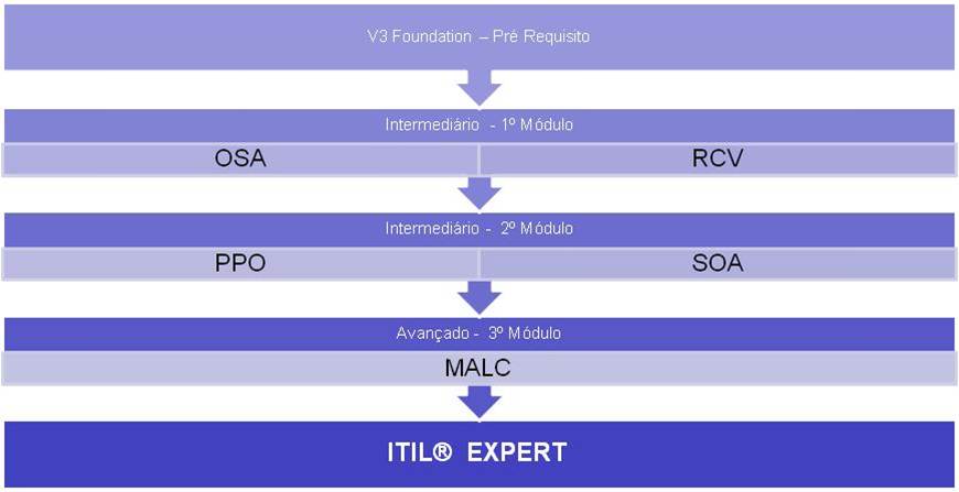 Programa Expert Capability: o programa Expert considera que o profissional já tenha o certificado ITIL® Foundation e através da combinação dos treinamentos intermediários Capability + MALC, o profissional obterá os 22 créditos necessários à qualificação Expert: São 3 etapas de estudos presenciais, as quais podem ser adquiridas como Programa Expert Completo ou em partes como módulos combinados como seguem: